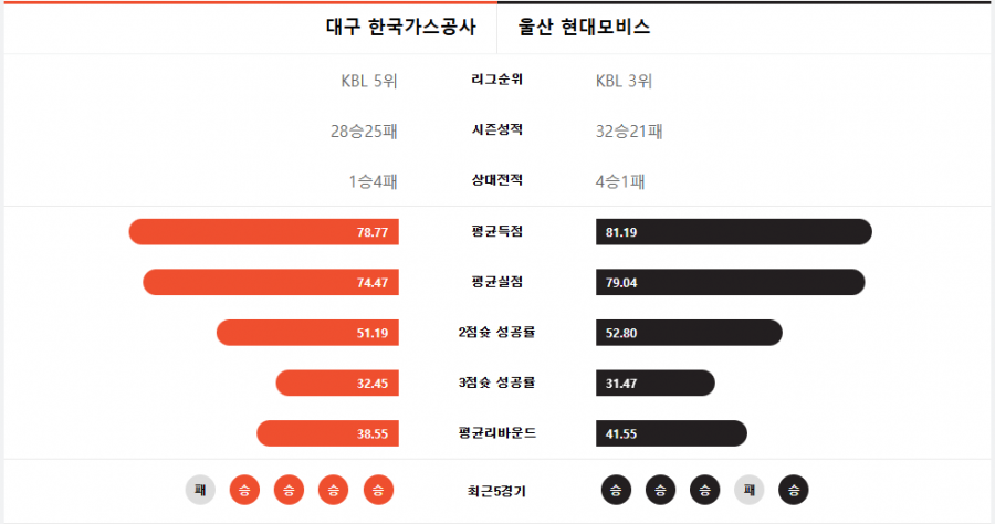 현대모비스가 가스공사를 높이로 제압할수 있을것으로 보임.